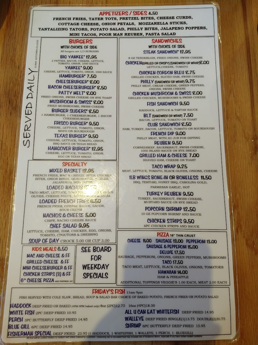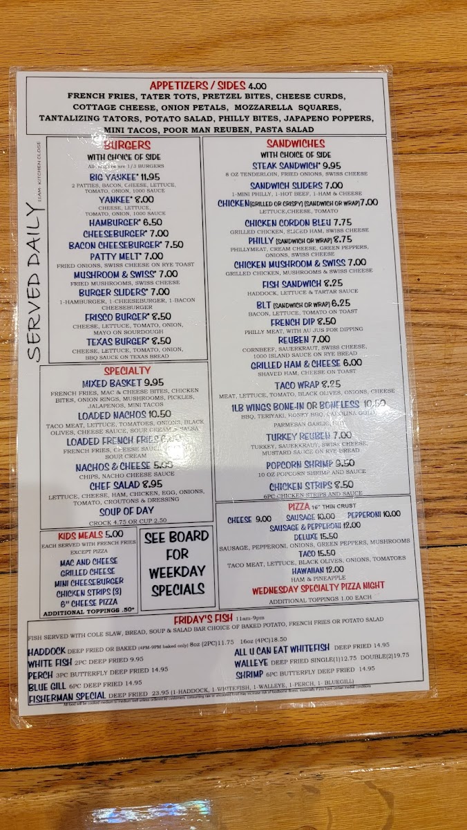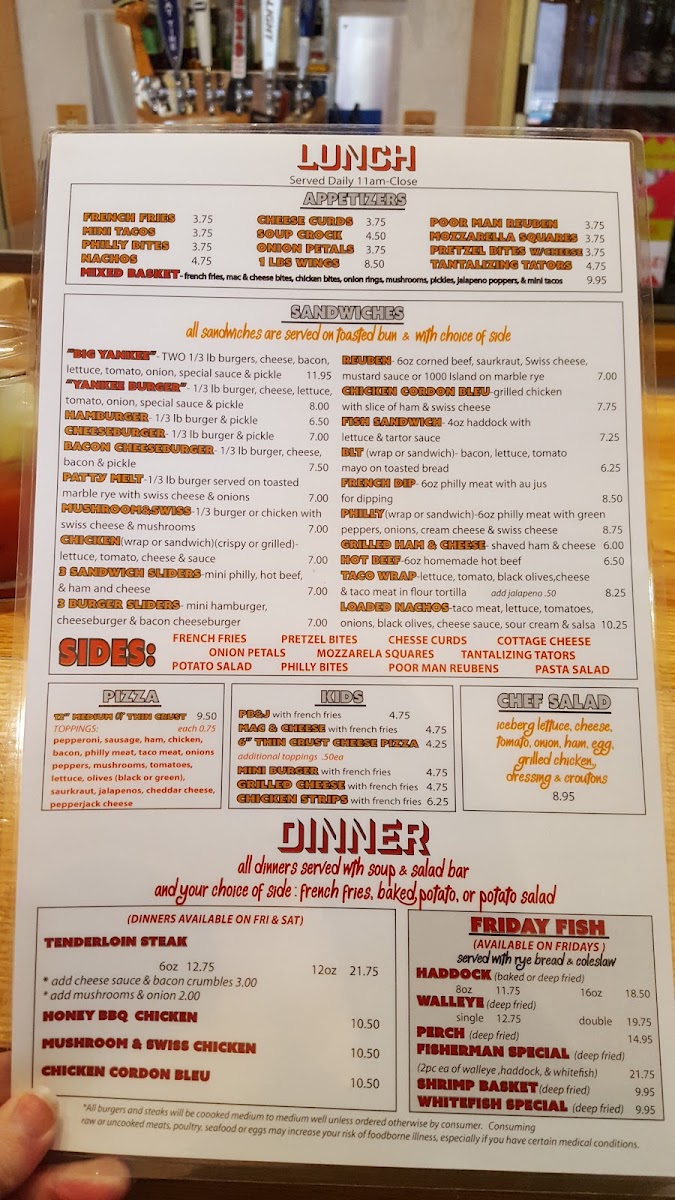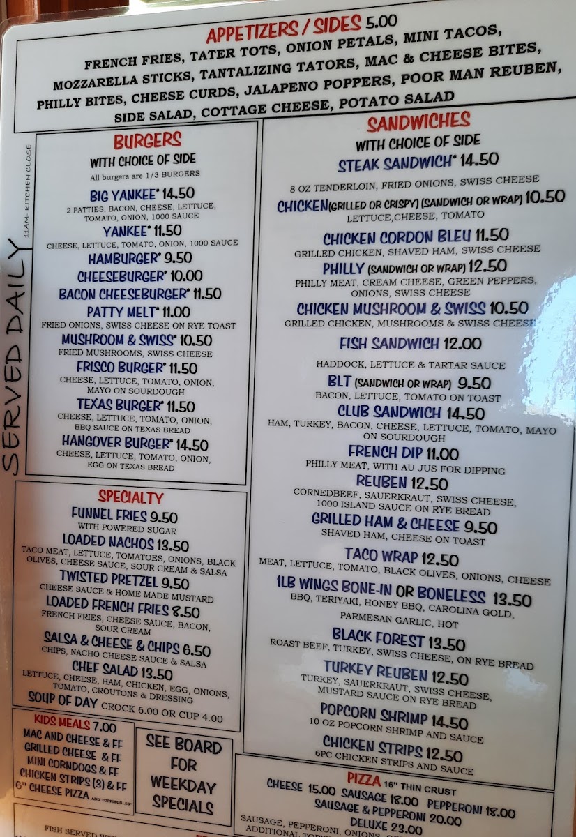 Start your day with warm griddles like fluffy pancakes or French toast, then transition into satisfying bites such as juicy cheeseburgers, the signature Yankee Burger, and crispy cheese curds. Appetizers including mozzarella sticks, onion petals, and tater tots complement a laid-back vibe, encouraging easy sharing and conversation. A fresh salad or a bowl of onion soup can provide a lighter alternative alongside these more indulgent options.